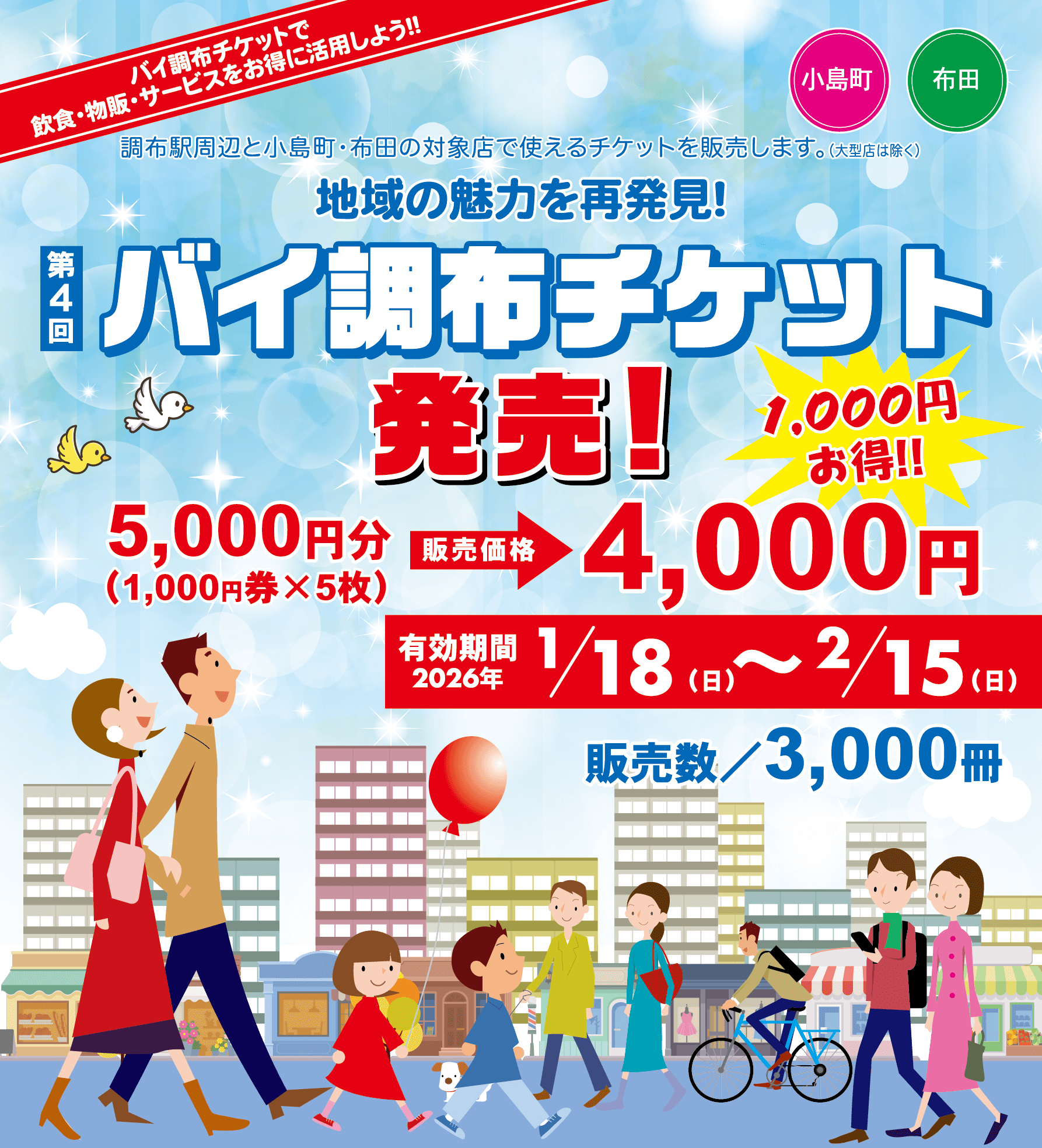 調布市商工会では2026年1月18日〜2月15日までの期間に、調布駅周辺と小島町・布田周辺で利用できる【第4回】バイ調布チケットを実施します。